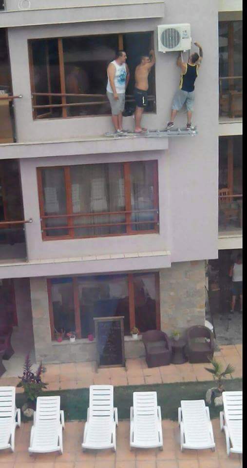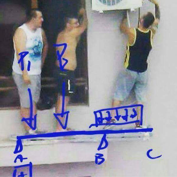 La foto si descrive da se , e la situazione si prospetta molto pericolosa. Ipotizzando la assoluta rigidezza della scala sotto i loro piedi, l’operazione sembra andare a buon fine. Ma la scelta di posizionare la persona più grossa sulla sinistra sará stata quella più giusta?